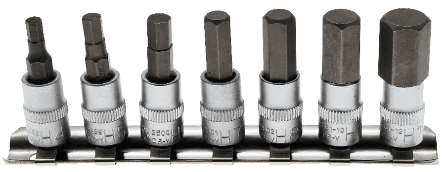 - Bit-Einsätze, Antrieb Innenvierkant 6,3 mm (1/4″), Abtrieb Innensechskant 4 – 5 – 6 – 7 – 8 – 10 – 12 mm