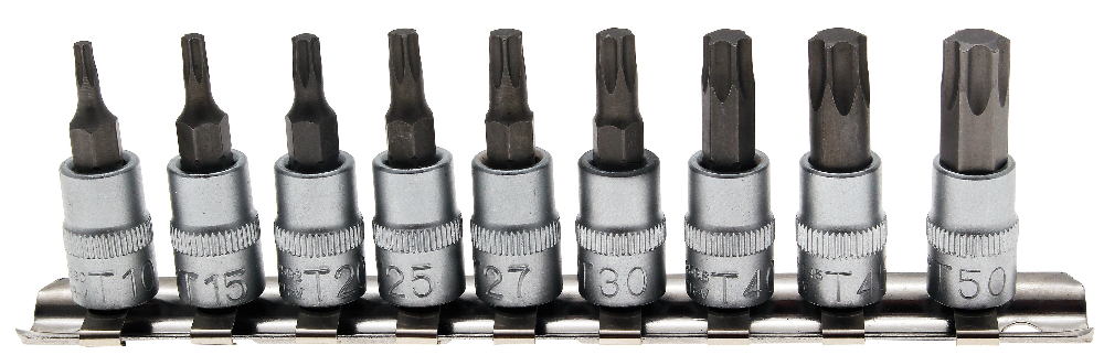 - Bit-Einsätze, Antrieb Innenvierkant 6,3 mm (1/4″), Abtrieb T-Profil (für Torx): T10 – T15 – T20 – T25 – T27 – T30 – T40 – T45 – T50