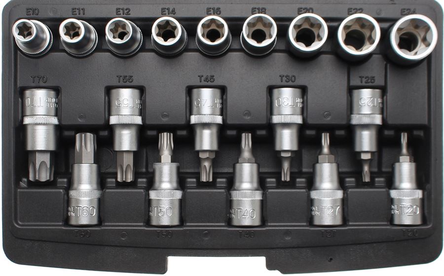 Bit-Einsatz-/Steckschlüssel-Satz | Antrieb Innensechskant 12,5 mm (1/2″) | T-Profil (für Torx)/E-Profil | 19-tlg.