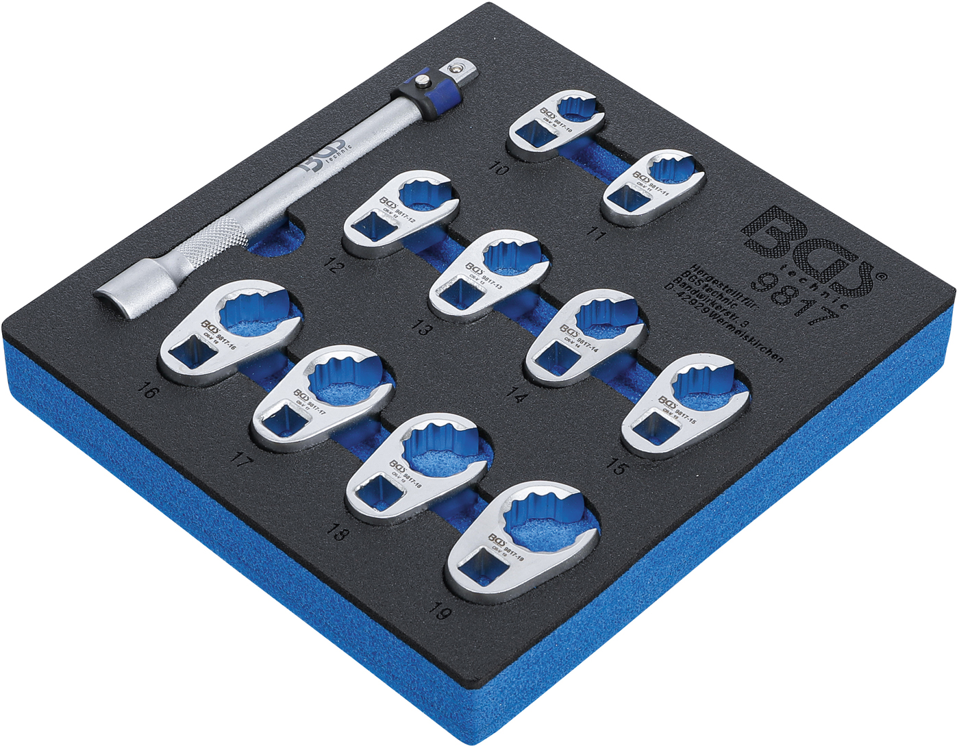- Hahnenfuß-Schlüssel Antrieb Innenvierkant 10 mm (3/8″): SW 10 – 11 – 12 – 13 – 14 – 15 – 16 – 17 – 18 – 19 mm