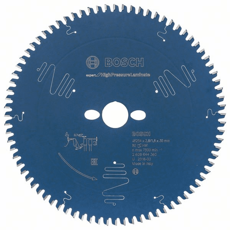 Kreissägeblatt Expert for High Pressure Laminate EX TR B 254×30-80. Kreissägeblatt für Kapp-, Gehrungs- und Paneelsägen. Außendurchmesser: 254 mm, Bohrung: 30 mm, Schnittbreite: 2,8 mm, Stammblattstärke: 1,8 mm, Zähnezahl: 80.