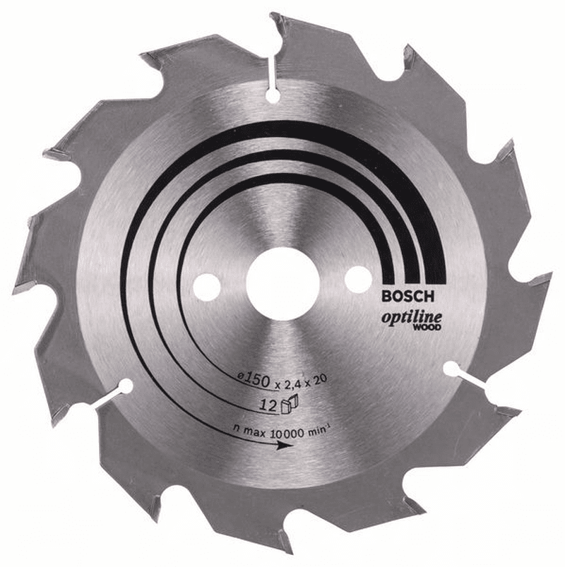 Kreissägeblatt Optiline Wood für Handkreissägen. Außendurchmesser: 150 mm, Bohrung/Bohrung mit Reduzierring: 20/16 mm, Schnittbreite: 2,4 mm, Stammblattstärke: 1,4 mm, Zähnezahl: 12, Typ: Standard for Wood, Zahnform: WZ, Schnittresultat: 1,0, NL/Durchmesser TKS: 7/42. Das präzise Blatt für den Qualitätsschnitt in allen Holzarten. Grober Schnitt: Das Universelle für den schnellen, präzisen Qualitätsschnitt bei allen Standardanwendungen der Holzbearbeitung in Weich-, Hart-, Press-, Schicht- und Sperrholz sowie Span- und Tischlerplatten. Die induktiv aufgelöteten Hartmetall-Wechselzähne (WZ) mit aggressivem Schnittwinkel sorgen für einen gleichzeitig schnellen und präzisen Schnitt. Das universelle Sägeblatt ist aus formstabilem Stahl. Spezielle Dehnungsschlitze verhindern eine Ausdehnung des Kreissägeblattes. Für professionelle Anwendungen.