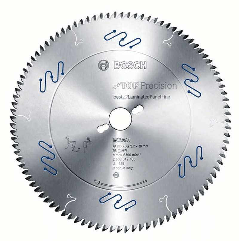 Kreissägeblatt Top Precision Best for Laminated Panel Fine für horizontale/vertikale Format- und Tischkreissägen, Außendurchmesser: 350 mm, Bohrung: 30 mm, Schnittbreite: 3,5 mm, Zähnezahl: 108, für perfekte Schnitte in ein- oder zweiseitig dünn beschichteten und furnierten Plattenwerkstoffen, WZ: geeignet für alle Format- und Tischkreissägen, Zähne aus Microteq: Hartmetallzähne aus besonders dichtem Hartmetallpulver mit mikrofeiner Körnung minimieren die Abnutzung der Schneide für beste Schnittqualität und besonders hohe Lebensdauer, Beschichtung Cleanteq: verringert das Anhaften von Rückständen (Harz, Leim), dadurch extrasaubere Ergebnisse, schützt das Blatt vor Korrosion, hält das Blatt kühl, Vibrationsminderung mit Stabilteq: Polyrethangefüllte Dämpfungsschlitze verringern stark die Vibrationen und Geräuschentwicklung, dies verbessert die Schnittpräzision und den Arbeitskomfort, mit lasergeschnittenen Dehnungsschlitzen für hohe Blattstabilität und Genauigkeit, die besondere Gestaltung sorgt für geringere Geräuschpegel, Stahlkörper: erstklassiger Stahl (bis HRC 46) für hohe Haltbarkeit, lasergeschnitten für hohe Präzision ohne Blattverzug, dank dem speziell eingerollten Spannungsring bleibt das Blatt auch im Einsatz formstabil und perfekt eben, Schnittresultat: sehr feiner Schnitt, Spanwinkel 5 Grad, Freiwinkel 25 Grad