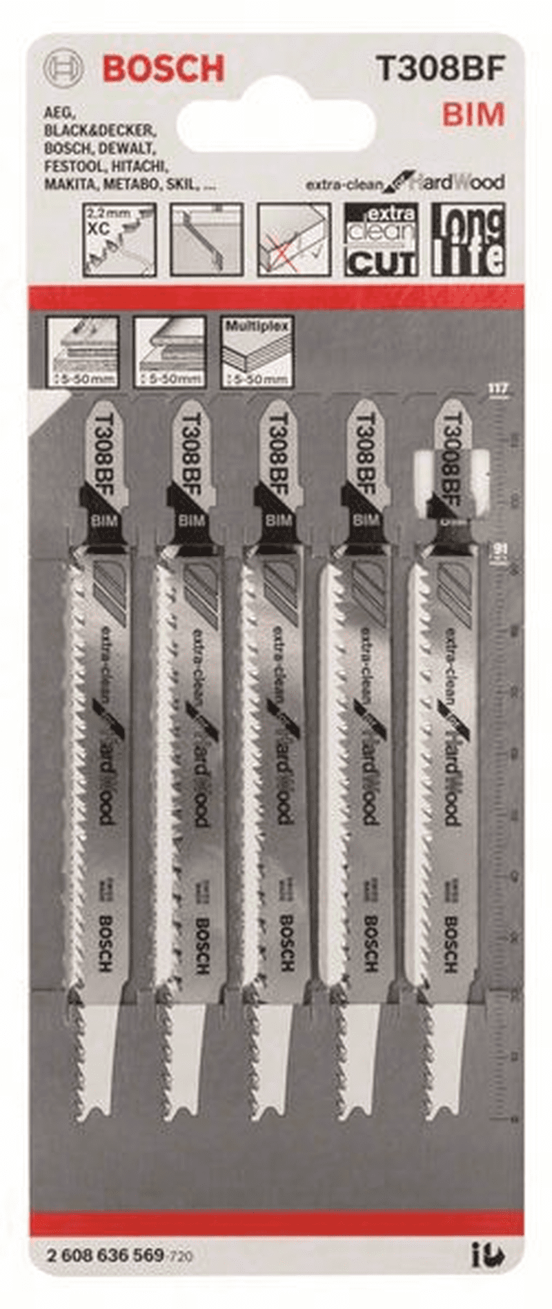 Stichsägeblatt Extraclean for Hard Wood. Typ: T 308 BF. Werkstoff: BIM. Zahnausführung: freiwinkel-, zähnegeschliffen, Gesamtlänge: 117 mm, Zahnteilung: 2,2 XC mm. Einnockenschaft. Für ausrissfreies Schneiden. Einsatzbereiche: Für Hartholz und abrasive Holzwerkstoffe. Für Weichholz, Platten, Sperrholz, Hartholz, Platten, beschichtete Platten und Multiplexplatten von 5 bis 50 mm Stärke. Für Küchenarbeitsplatten kleiner als 50 mm Stärke. Inhalt der Verkaufspackung: 5 Stück.