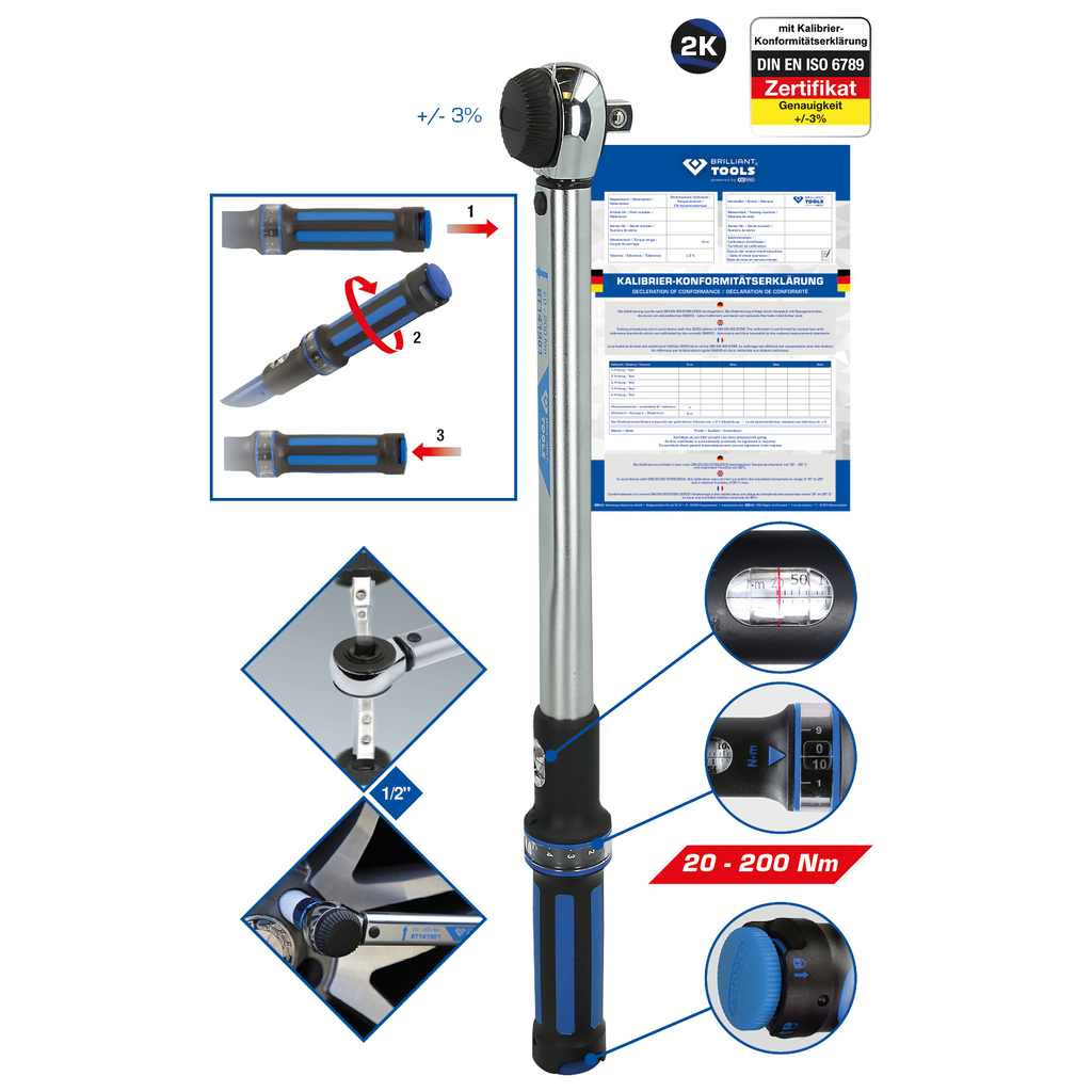 - Mithilfe dieses BRILLIANT TOOLS Profi-Drehmomentschlüssels BT141901 lassen sich Schrauben und Muttern kontrolliert anziehen. Seine Einsatzmöglichkeiten sind sehr vielseitig. Die exakte Einstellung des gewünschten Drehmoments ist denkbar einfach und lässt sich sehr gut an der im Griff integrierten Skala ablesen. Auch die Feineinstellung, dank Mikrometerskala, ist hier möglich. Damit lassen sich Werte wie z.B. 84 Nm realisieren. Zum Einstellen muss nur die Verriegelung im Griff gelöst und dieser bis zum gewünschten Wert gedreht werden, anschließend wieder verriegeln. Durch den Drehmomentbereich von 20 – 200 Nm lassen sich verschiedenste Arbeiten an PKW oder Transporter erledigen. Der gut hör- und fühlbare Auslöse-Mechanismus, signalisiert Ihnen das Erreichen des eingestellten Drehmoments. Sein 1/2″ Kopf kann umgesteckt werden und ist somit für Rechts- und Linksgewinde geeignet.