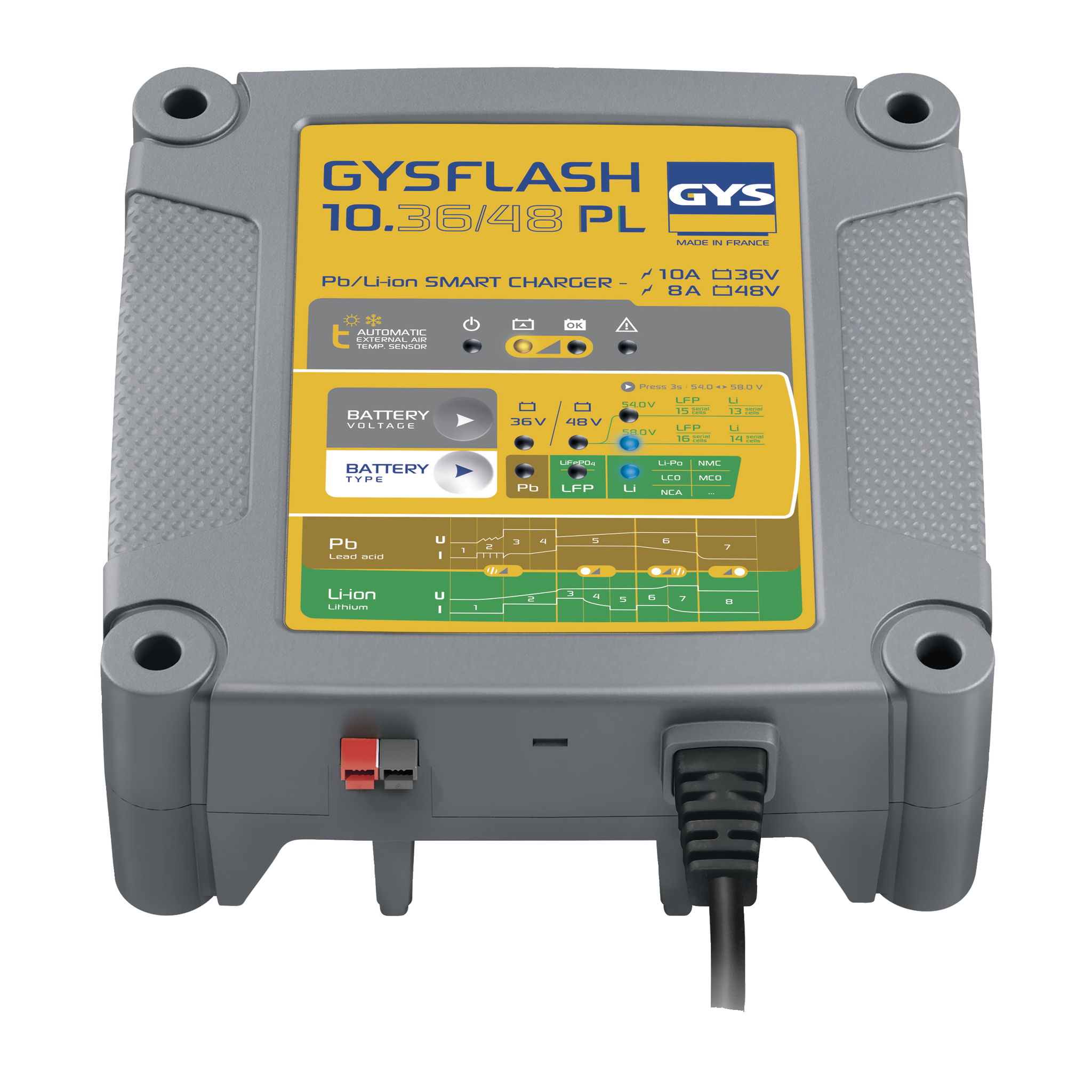 36/48 PL ist ein Profi- Ladegerät für Fahrzeuge mit 36V und 48V für Blei-Säure- und Lithium-Eisen-Phosphat-Batterien (LiFePO4).