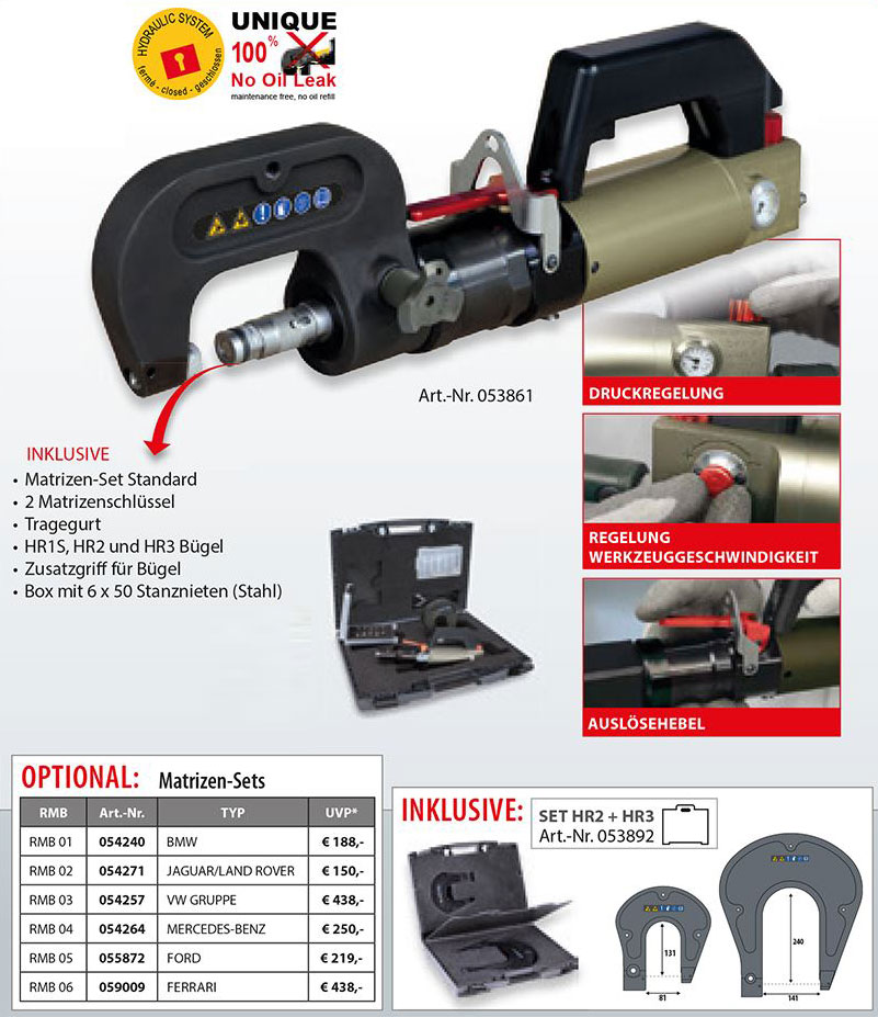Modular aufgebautes Nietgerät mit Druckregelung zur Applikation (und Entfernung) diverser in der Karosseriereparatur zu verarbeitenden