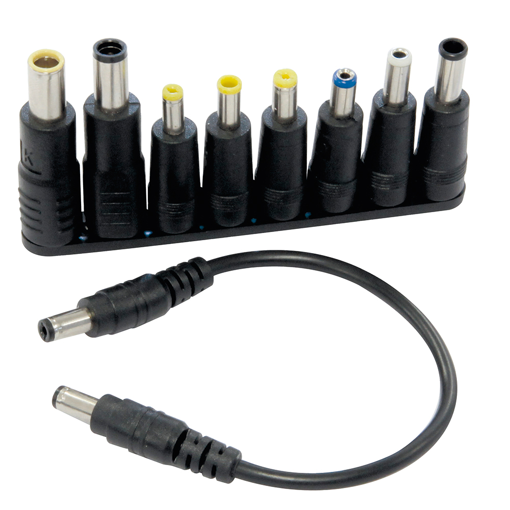 – ein 19V (3.5A) PC-Anschluss mit 8 Steckeradaptern zum Betrieb und Laden der meisten Laptops.