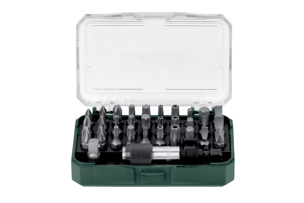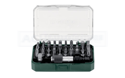 Bits aus Chrom-Vanadium-Stahl (S2-Qualität); Magnetischer Bithalter; Mit Adapter für Steckschlüsseleinsätze (Stecknussadapter); Hochwertige, robuste Box im speziellen Metabo-Design