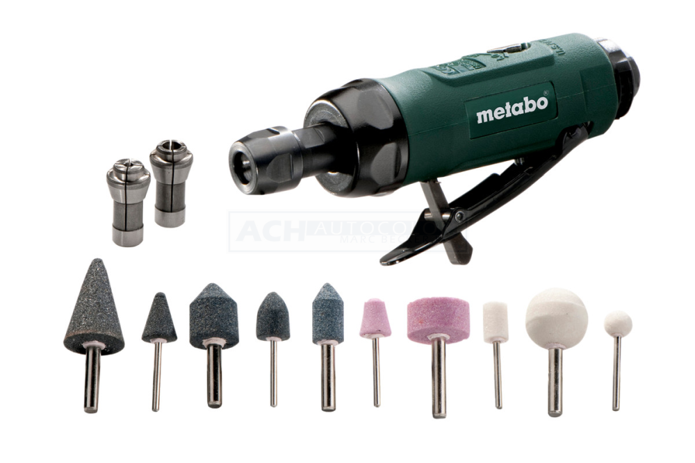 EURO Stecknippel 1/4″, ARO/Orion Stecknippel 1/4″, ISO Stecknippel 1/4″, 2 Spannzangen (3 mm, 6 mm), je 5 Schleifstifte (3 mm, 6 mm), 2 Maulschlüssel (13 mm, 16 mm), Kunststoffkoffer